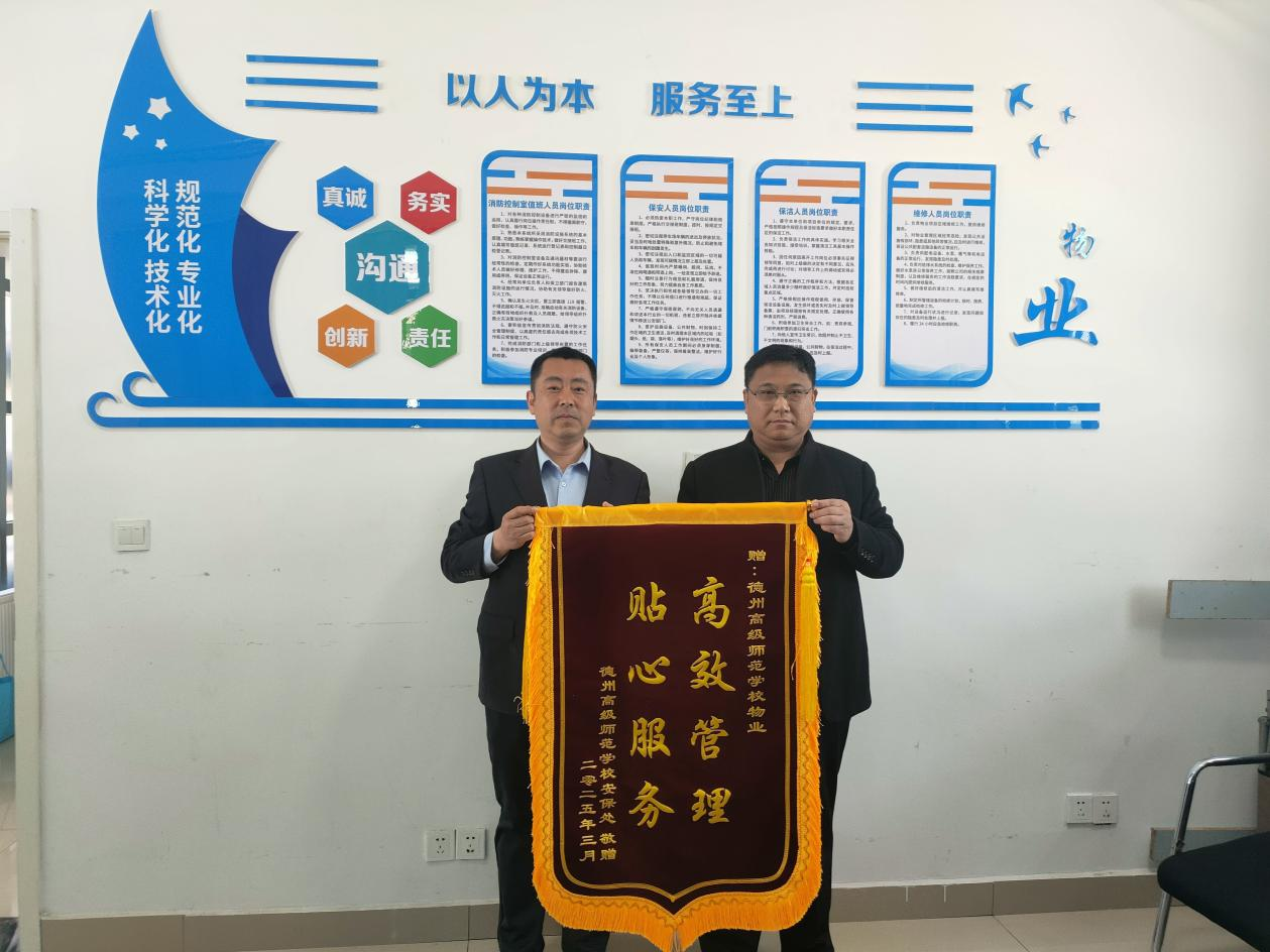 近日,德州高級師范學(xué)校安保處主任張世忠將一面印有“高效管理 貼心服務(wù)”的錦旗送到鑫昌物業(yè)公司高師項目負(fù)責(zé)人李愛華手中,這面錦旗既是校方對物業(yè)服務(wù)品質(zhì)的認(rèn)可,更是對鑫昌物業(yè)公司2025年管理服務(wù)提升年工作成效的生動詮釋。